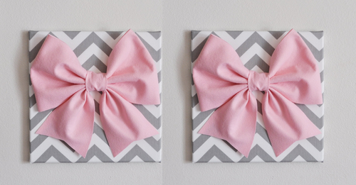 Set of Two Large Light Pink Bow on Gray and White Chevron 12 x12" Canvas Wall Art- Baby Nursery Wall Decor- Zig Zag