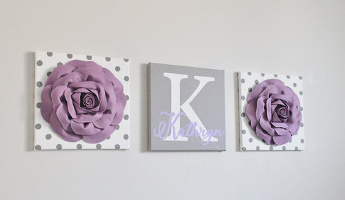 Two Wall Hangings -Large Bow on Gray with White Polka Dot Canvas Wall Art- Baby Nursery Wall Decor-